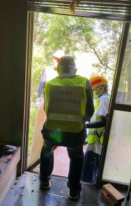 本日は、突風により位置がずれてしまった倉庫の移動、細断した倒木の運び出し、畳や家財道具等の運び出し、破損した屋根の対応といった作業を行いました。