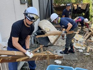 1件目は、瓦や木材の運び出し。2件目は、田んぼに散乱した木やガラスの回収。3件目は、壊れた倉庫の解体でした。